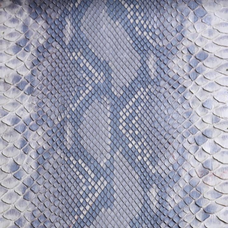 Натуральна шкіра пітона в шматках, розрізана по животу або по спині, має характерний природний сірий візерунок з подальшим розфарбуванням в сіро-рожево-блакитні кольори з глянсовим покриттям.